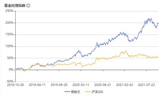 总体而言,截至三季度末,杨锐文今年以来的综合表现仍然可圈可点,其旗下代表产品相较于沪深300的超额累计收益率达到了14.03%。而将时间拉长至三年期后,杨锐文的整体业绩仍然处于波动上行的状态。